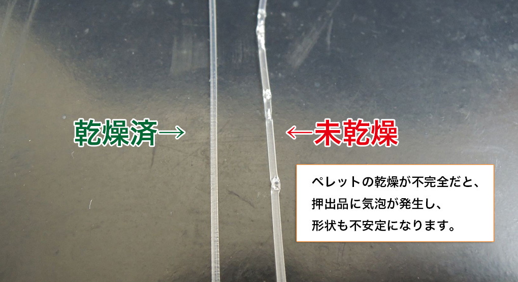 ペレットの乾燥が不十分なまま成形すると、粘度の低下による金型内の材料流動の変化や、水分の発泡が成形品に形状の乱れや気泡となって表れます。アイ・ティー・エス・ジャパンは、確実な乾燥とそれを数値化して評価できるシステムの両面から継続的な安定成形をサポートします。